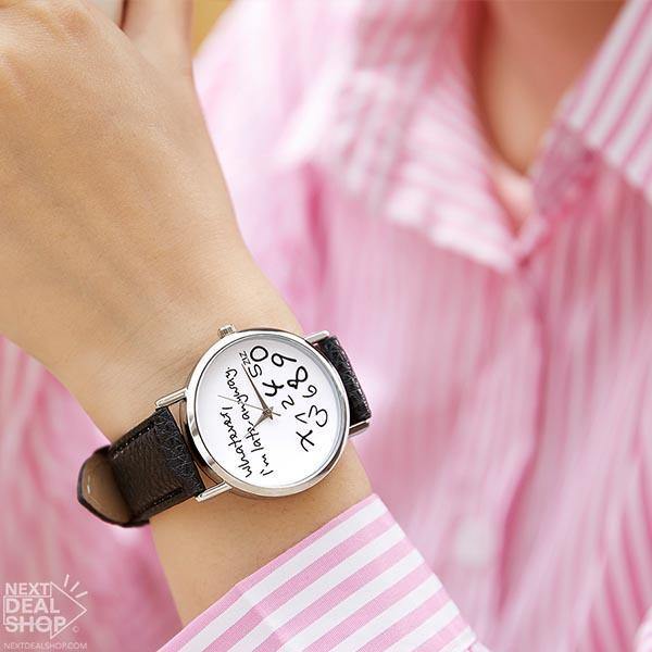 - Estampa "Que seja, eu estou atrasada mesmo." no relógio: único e diferente